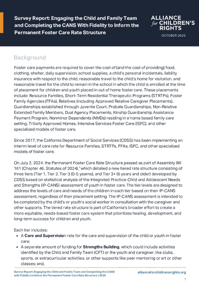 The Alliance for Children’s Rights conducted a voluntary, online survey in June of 2025 targeting stakeholders in the child welfare system, including caregivers, parents, current and former youth in foster care, service providers, and advocates. The survey aimed to gather input on the implementation of Child and Family Team (CFT) meetings and the Integrated Practice–Child and Adolescent Needs and Strengths (IP-CANS) assessment, both of which play a critical role in case planning and determining foster care rates under California’s new Tiered Rate Structure.